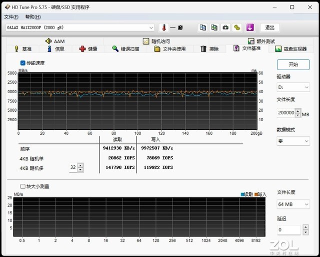 在HD Tune Pro中出现了有趣的现象,由于这款软件比较老牌了,似乎没有预料到日后的硬盘速度能达到如此速度,因此文件基准曲线左侧的Y轴数据均被“吃掉”了最左侧的一位。我们向名人堂影驰名人堂HOF EXTREME 50S 2TB中写入200GB的数据,可以看到写入速度在10000MB/s小幅波动,读取速度则在9800MB/s小幅波动,至测试完成也没有出现明显掉速,可见SLC缓存容量较大。