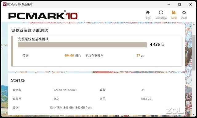 接下来我们用PCMARK10完整系统盘测试来测试名人堂影驰名人堂HOF EXTREME 50S 2TB固态硬盘的表现,最终测试成绩为4435分,带宽为694.06MB/s,平均存取时间进一步降低至37μs。