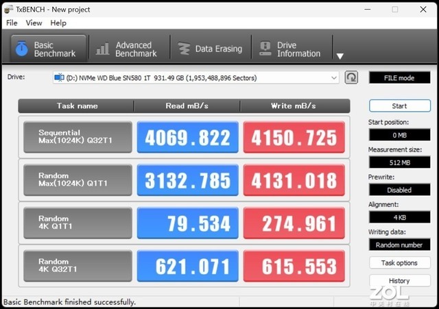 在用于对比的TxBENCH中,西部数据 SN580 1TB最高顺序读写速度为4069.822MB/s和4150.725MB/s,总体看与标称相差不大。