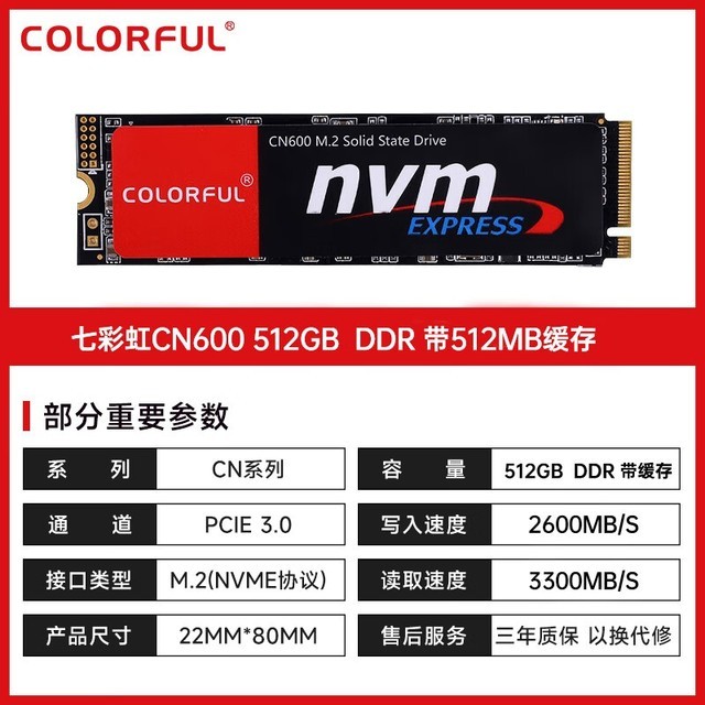 七彩虹 CN600 SSD固态硬盘 M.2接口 (NVMe协议)PCIe3.0 TLC颗粒 512G【带512MB DDR缓存】