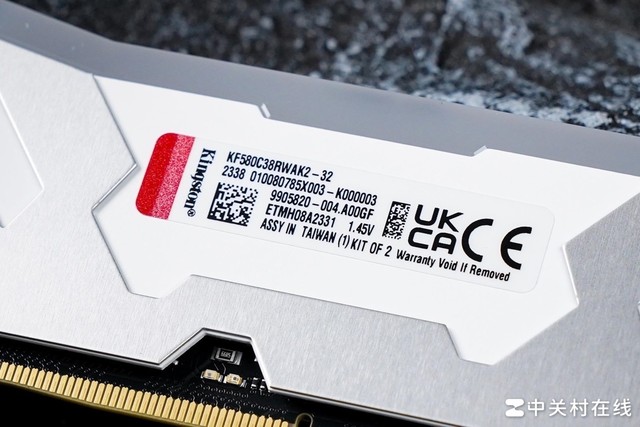 从标签看,叛逆者(Renegade)DDR5-8000 RGB内存型号为KF580C38RWAK2-32,其中KF即为KINGSTON FURY系列,5为DDR5,80即XMP8000MT/s的性能,C38即CL38时序,WAK2-32就是两根装,单根16GB,整套容量32GB,XMP电压为1.45V。