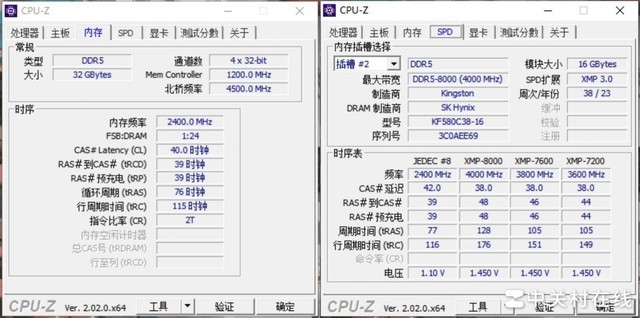 如今7000MT/s已经成为高性能DDR5内存的起步点,而Kingston FURY叛逆者(Renegade)DDR5 RGB将这个目标提升到8000MT/s可以说是意义非凡。通过CPU-z可知我们手中的这套内存采用SK海力士颗粒,拥有7200、7600和8000三档XMP频率,最高档8000的时序为38-48-48-128,电压为1.45V。