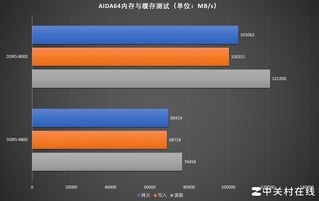 在AIDA64内存和缓存测试中,DDR5-4800起始频率读写速度为76458MB/s和68718MB/s;XMP DDR5-8000频率读写速度达到121200MB/s和100351MB/s,性能提升幅度巨大。