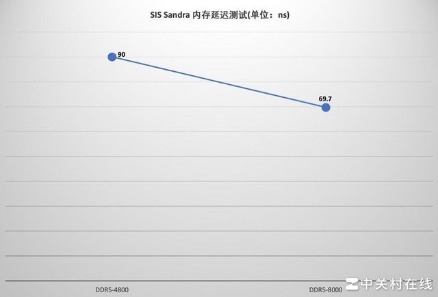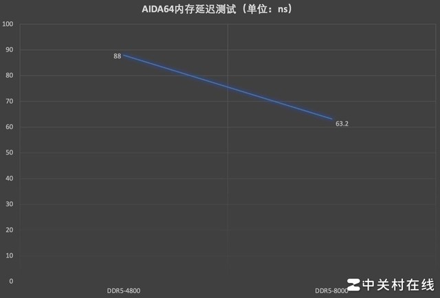 超频后内存的延迟是下降趋势,在DDR5-4800频率下为88ns,XMP DDR5-8000频率延迟下降到63.2ns。