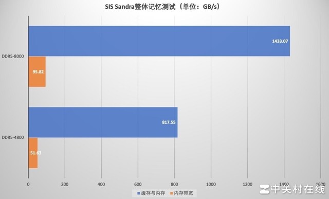 在SiS Sandra的整体记忆测试中,DDR5-4800初始带宽成绩为51.63GB/s,延迟90ns;XMP DDR5-8000带宽成绩达到了95.82GB/s,延迟则降低至69.7ns。SiS Sandra和AIDA64测试结果都表明,内存频率的提升会抵消高时序带来的不利影响,对于提升带宽、降低延迟都有积极作用。
