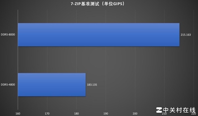压缩软件对于内存带宽比较敏感,在7-Zip基准测试,在DDR5-4800频率下,评分为183.135GIPS,XMP DDR5-8000频率成绩升至215.163GIPS,极大提升软件的效率。