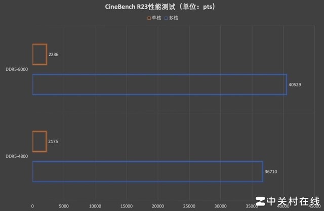 最后是CineBench R23的测试,通过单线程和多线程的渲染场景来表现内存频率提高后对于CPU性能的影响。在DDR5-4800频率单核成绩为2175pts,多核成绩为36710pts;XMP DDR5-8000频率单核成绩达到了2236pts,多核成绩为40592pts。