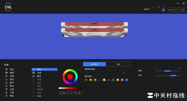 在金士顿灯效管理软件FURY CTRL中,提供了多达18种灯光效果,最后六种需要四根内存插满才能开启。灯效选中后可以出现预览效果,当然玩家也可以自己定制灯光的亮度、变换的方向和速度,部分灯效还支持颜色的定制,最后一起看下绚丽的灯效吧。