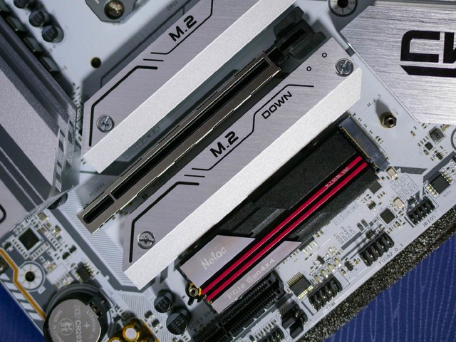 彩虹B760M的三个M.2正好有一个固态位置没有散热,可以直接安装朗科 NV7000。主板的M.2固态安装采用无螺丝设计,安装非常方便。