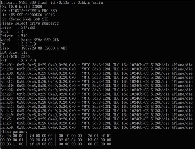 闪存颗粒型号为NTEF04TY3EL1G9,通过flashID查询可以看出,采用Xtacking2.0架构的128层3DNANDTLC颗粒,采用Xtacking2.0架构,相对于64层堆叠颗粒,每个芯片的容量达到512GB。