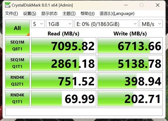 连续读取7095MB/s的CrystalDiskMark测试,以6713MB/s的写入速度,均超过了官方标称的7000MB/s和6700MB/s,这也是目前旗舰级固态的读写速度。相对来说,官方给出的参数有些保守。
