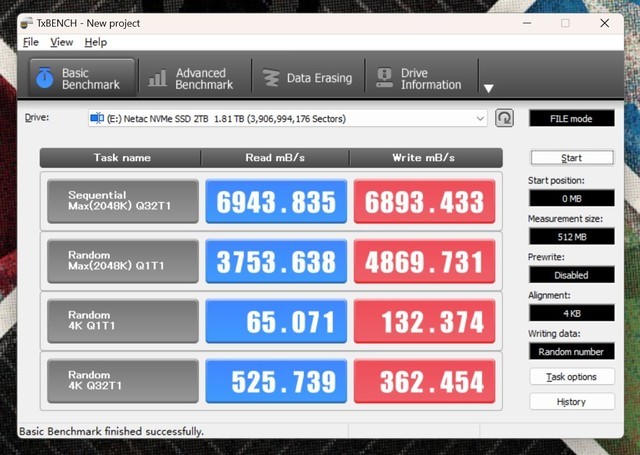 TxBENCH测试,测试结果与CrystalDiskMark基本相同。读写速度分别为6943MB/s和6893MB/s。