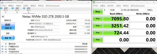 在PCIe4.0X4模式下,朗科 NV7000运行支持NVMExxpress1.4和动态写入缓存技术,通过CrystalDiskInfo确认,每天待机温度为54℃,温度略高。