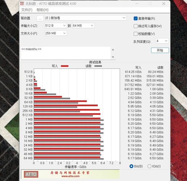 ATTO磁盘基准测试软件是一款用于测试不同大小磁盘文件传输速度的软件,可以帮助用户了解不同比例文件对磁盘速度的影响。当文件大小为128KB时,实际测量文件的写入速度可以达到6GB/s的全速,文件在1MB时可以读取6.5GB/s的全速。