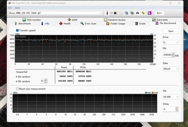 因为SSD不能通过软件查看缓存信息,所以在这里使用HDTunePro文件基准测试来查看缓存容量和缓存外读写速度。选择20000MB的大文件块进行测试,在200GB的读写测试中没有出现缓外掉速的情况,与目前许多使用无缓存方案的固态硬盘相比,在超大数据量的读写方面仍然具有一定的优势。