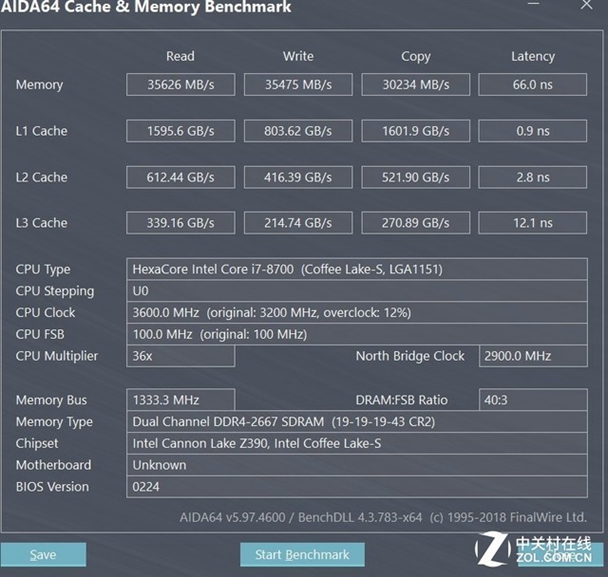 我们可以看到在2666MHz频率下,读取速度为35626MB/S,写入速度为35475MB/S,copy速度为30234MB/S,此时的延迟为66ns,这样的表现延续了自家电竞产品应有的水平,在笔者的意料之中。
