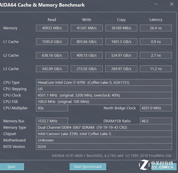 我们可以看到,在3066MHz频率下,读取速度为40933MB/S,写入速度为41341MB/S,copy速度为36189MB/S,此时的延迟为56.4ns,这样的表现相当不错,是一款电竞产品应该具有的素质。