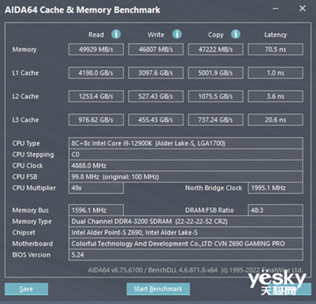 内存读取4929MB/s,内存写入46807MB/s,内存复制47222MB/s,延迟70.5ns。