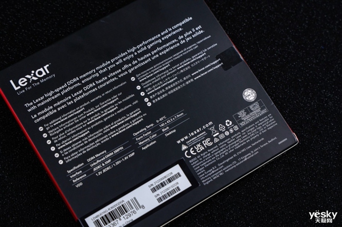 包装背面印有各种语言的官方网站和其他产品信息,以及左下角的条形码标签。从产品信息可以看出,该雷克沙 32GB DDR4 3600内存的尺寸规格为140*43.3*7.9mm,供DIY用户使用CPU风冷散热器参考。