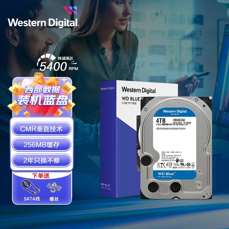 西部数据 Blue 台式机硬盘 WD Blue 西数蓝盘 4TB 5400转 256MB SATA 3.5英寸CMR垂直技术DIY电脑存储机械硬盘
