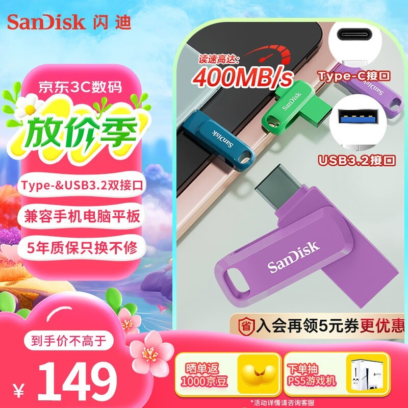 SanDisk推出一款超实用的256GB Type - C USB3.2 U盘,颜色是丁香紫,颜值超高。闪迪 DDC3可是至尊高速DDC3系列,读取速度能达到400MB/s,并且有着手机和笔记本电脑双接口的设计,使用起来非常方便。