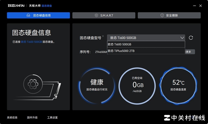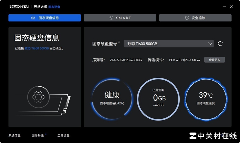 为了让大家对致态天枢大师的功能有具体的了解,我们以致态Ti600固态硬盘为例进行演示操作。这款软件无需安装,双击ZHITAI UNI MASTER SSD.exe即可运行,UI采用黑色的主色调+深灰色的模块和按钮,呈现简洁沉稳的风格,最上方是三个操作按钮,启动后默认显示的是固态硬盘信息。