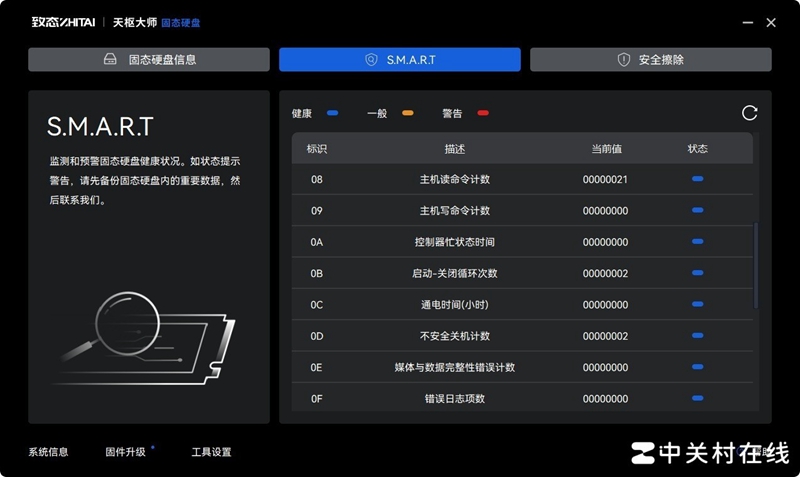 第二个按钮是S.M.A.R.T状态查看,它就像固态硬盘的健康管理师,可以查看致态固态硬盘硬件本体的详细健康状况,并在发现异常状态时发出警告,提醒用户提前做好数据备份,降低数据丢失的风险。