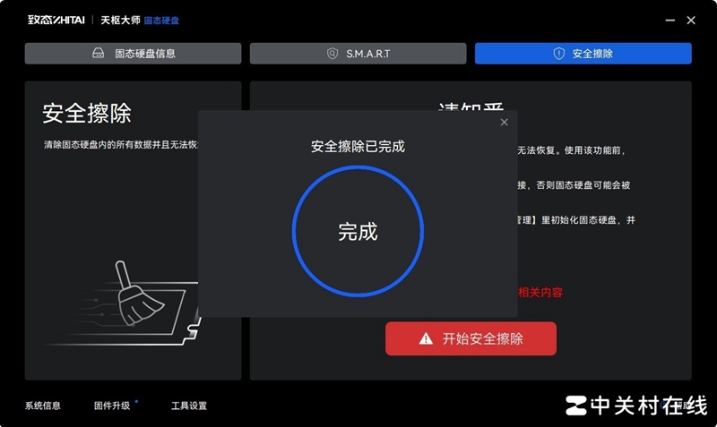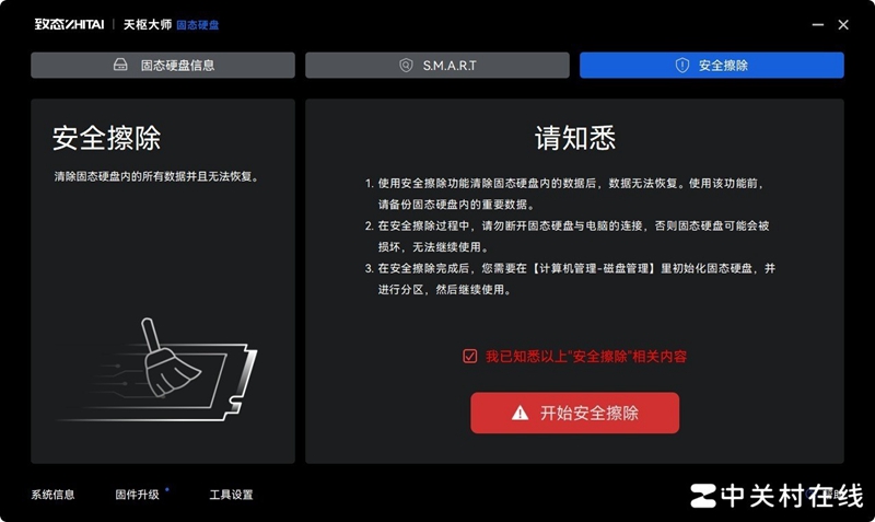 第三个按钮是安全擦除功能,这个功能主要是在固态硬盘的出让、转增或者销毁,将硬盘里面的数据彻底抹除销毁,确保数据无法被恢复,为用户提供最高级别的数据保护,所以在使用这项功能前,一定要再三确认里面的数据已经备份或者转移。