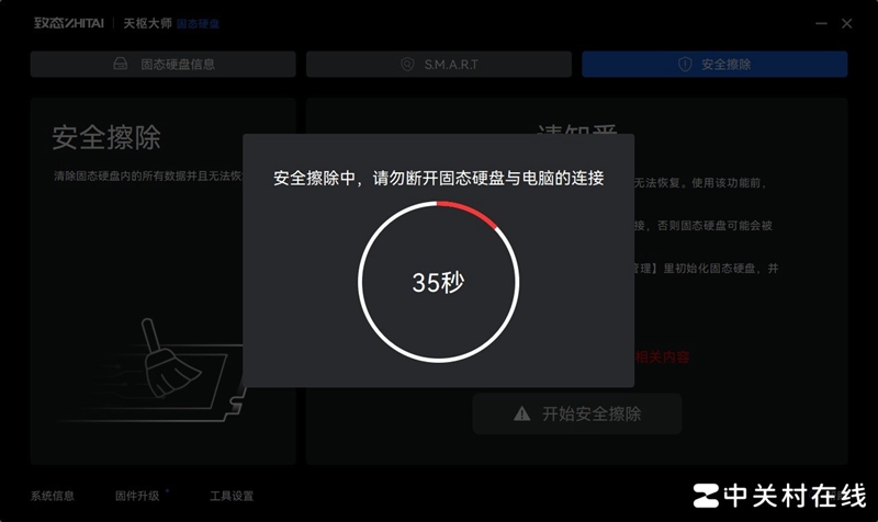 点击“开始安全擦除”的红色按钮,就会出现倒计时和进度圆圈。此时不要断电,更不能将固态硬盘从主板拔下来。