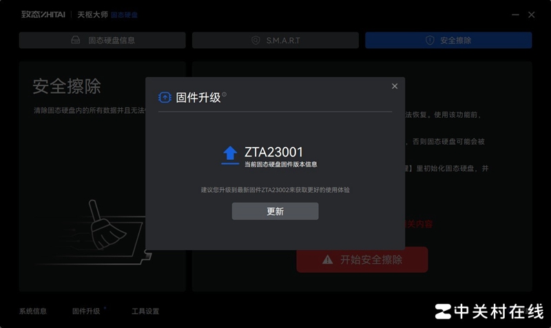 当然,固态硬盘的固件升级也是致态天枢大师的重要功能。当检测到当前固态硬盘的固件版本过旧时,软件下方的“固件升级”按钮右上方就会出现一个蓝色的小圆点,提醒用户及时升级,确固态硬盘始终处于最佳性能。点击“固件升级”按钮可以看到当前的固件版本,我们这块Ti600的版本是ZTA23001。