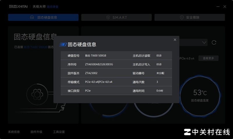 电脑关机后,重新开机并再次运行致态天枢大师,在固态硬盘信息中可以看到固件已经变成了ZTA23002,升级成功!