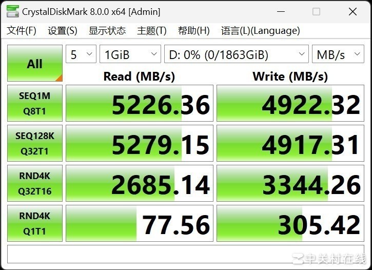 在Crystal Disk Mark中将测试数据设置为NVMe,经实测西部数据 SN50002TB最高连续读取速度为5226.36MB/s和4922.32MB/s,均超过5150MB/s和4850MB/s的标称值。