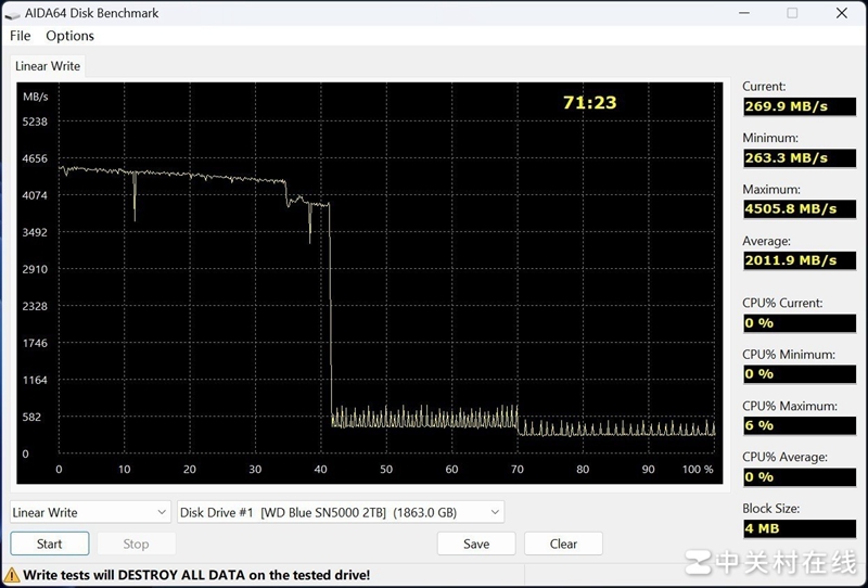 为了进一步探索西部数据 SN50002TB的SLC的缓存,我们使用AIDA64的LinearWrite进行全盘写入测试。从测试的图表来看SLC缓存42%左右用尽,因此SLC缓存容量高达840GB左右,极大的提升了大文件的写入效能。