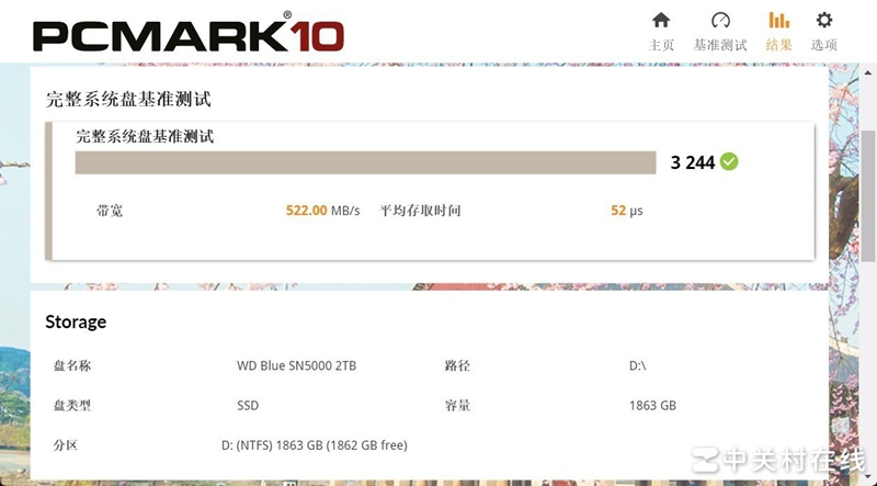应用模拟测试,先进行PCMARK10完整系统盘测试项目,模拟正常系统运行场景来测试西部数据 SN50002TB固态硬盘的表现。测试结果显示成绩为3244分,带宽为522MB/s,平均存储时间52μs。