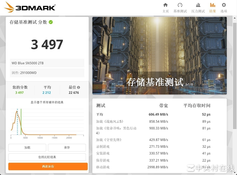 接下来是3DMARK中的存储测试DLC测试,该项测试通过多款游戏的载入、保存、安装与录制,为用户直观的展示固态硬盘的表现。最终西部数据 SN50002TB存储基准测试为3497分,平均带宽为606.49MB/s,平均存取时间为52us,符合中端PCIe4.0固态硬盘的定位。