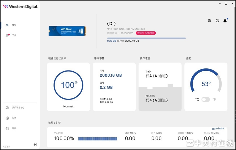 “买定离手,听天由命”,这是不少人购买完固态硬盘后的想法,仿佛自己的固态硬盘如同孤儿一般。而西部数据为旗下的固态硬盘推出了专属的管理软件“Western Digital SSD 仪表板工具”,可以让用户方便的查看固态硬盘的健康状态,以及进行固件升级等操作,非常贴心。
