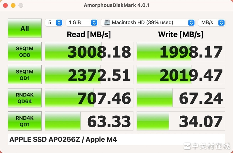 先看看理论的跑分情况,Amorphous Disk Mark测试结果显示,M4 Mac mini内置256GB固态硬盘顺序读写速度为3008MB/s和1998MB/s,比上代M2机型快了不少。
