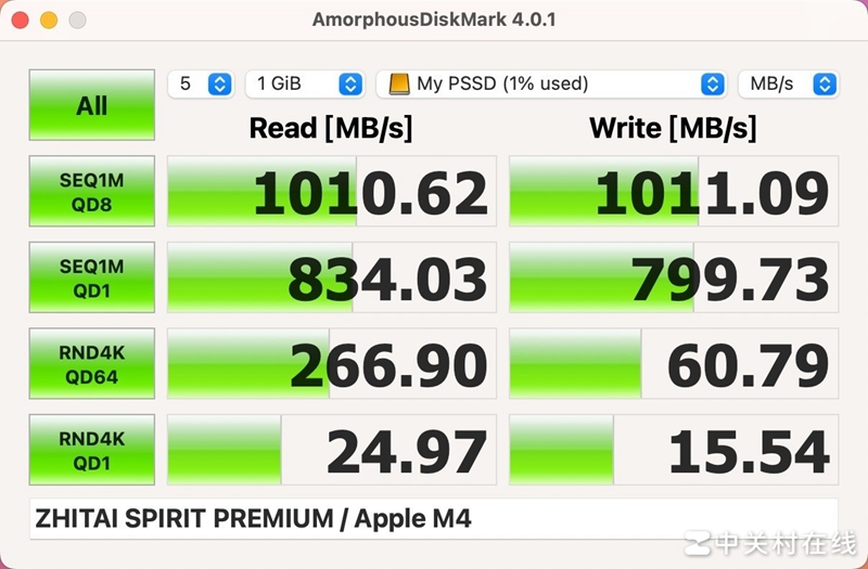 虽然万事俱备,但“东风”这事还是要给大家打个预防针。M4 Mac mini虽然配备了雷雳4接口,但由于苹果的硬件设计的限制,无法跑满USB3.2Gen2x2协议性能,这对于致态灵・先锋版移动固态硬盘可以说是暴殄天物,三分之二的理论性能就这样被禁锢了。