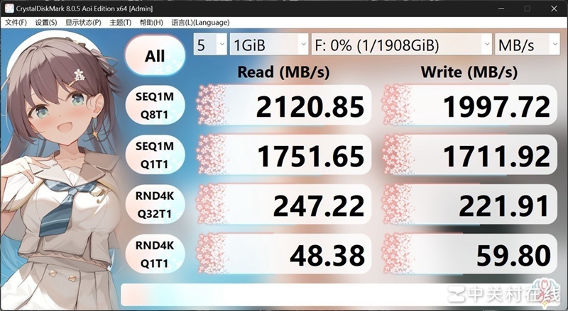 而在配备USB3.2Gen2x2接口的Windows PC中,致态灵・先锋版2TB顺序读写性能狂飙到了2120MB/s和1997MB/s,达到了USB3.2Gen2x2满血速度。