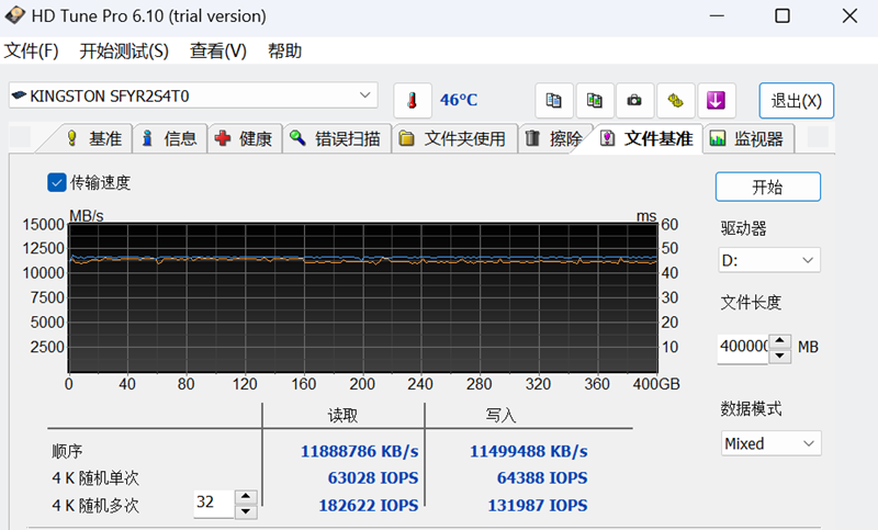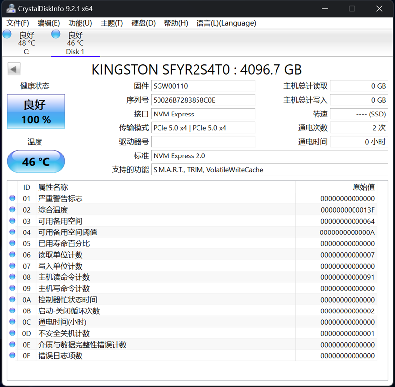 Crystal Disk Info显示Kingston FURY Renegade G5 4TB为4096.7GB足容量,采用PCIe5.0x4传输模式,支持NVMe2.0标准,以及S.M.A.R.T、TRIM和VolatileWriteCache功能。虽然这款产品没有配备散热片,但在27℃室温下闲时温度也只有46℃,甚至比主板上那块PCIe4.0的系统盘还要低2℃。