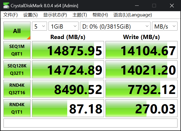 3、标称顺序读写速度14800MB/s和14000MB/s