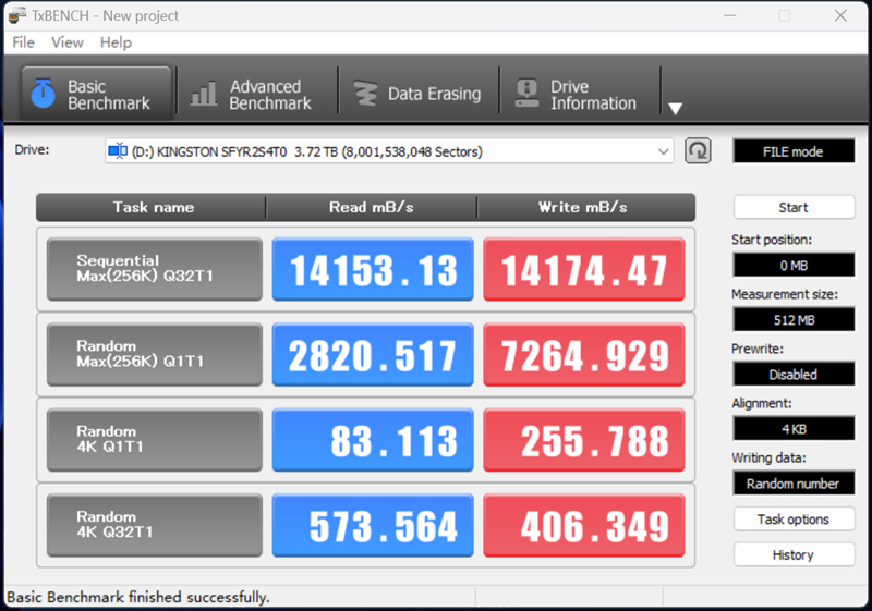 用于对比参考的TxBench测试结果显示,Kingston FURY Renegade G5 4TB连续读写速度均超过14100MB/s,相对于中高端PCIe4.0固态硬盘同样实现了翻倍。
