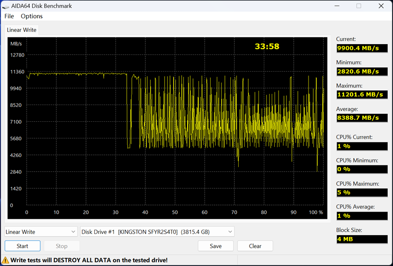 为了进一步验证,我们在AIDA64磁盘测试中执行Linner Write操作,从图形看Kingston FURY Renegade G5 4TB采用全盘模拟SLC缓存方案,缓内速度达到11000MB/s以上。在33%左右SLC缓存用尽,估算空盘状态SLC容量高达1.35TB,最大限度提升用户传输大量数据的效率。