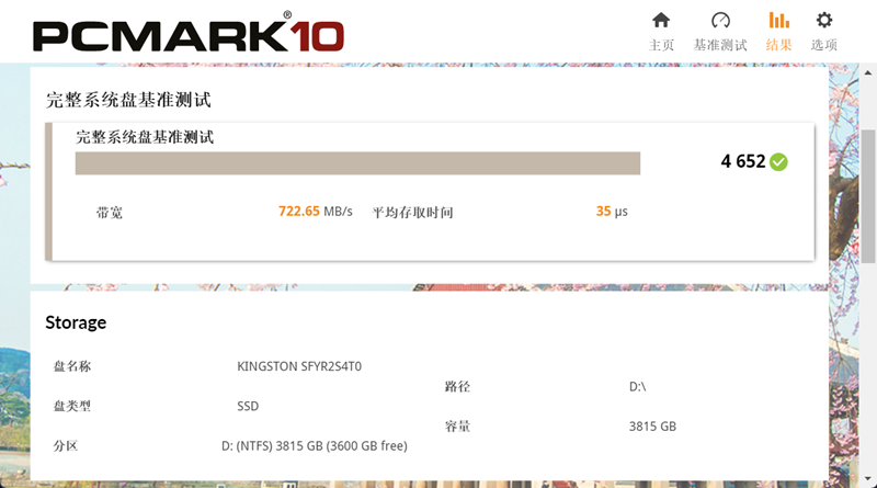 应用模拟测试可衡量固态硬盘在实际应用场景的表现。先执行PCMARK10完整系统盘基准测试,通过模拟安装在系统盘中的操作系统加载、各种办公软件的运行,来评估固态硬盘综合表现。Kingston FURY Renegade G5 4TB最终成绩为4652分,带宽为722.65MB/s,平均存取时间为35μs。