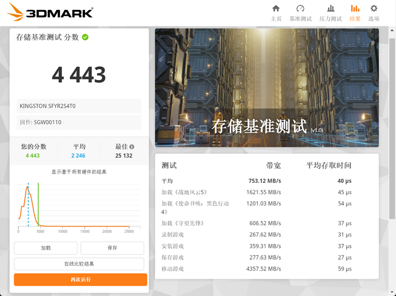 最后是3DMark中的存储基准测试。该项测试将模拟《战地风云5》、《使命召唤:黑色行动4》和《守望先锋》这三款游戏的安装、加载、录制和保存等操作,来衡量固态硬盘在实际游戏中的表现。Kingston FURY Renegade G5 4TB的最终得分为4443分,平均带宽753.12MB/s,平均存储时间40us。