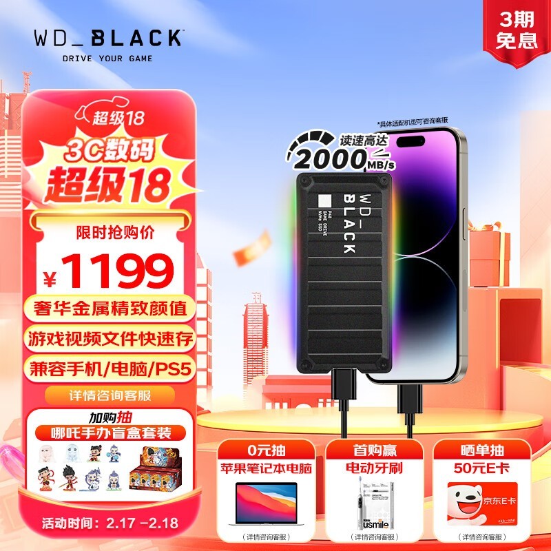 秒杀活动来了!京东自营的西部数据 P40 USB3.2Gen移动固态硬盘Type-C 2TB 黑色现在抢购只需1199元,比原价便宜了80元!