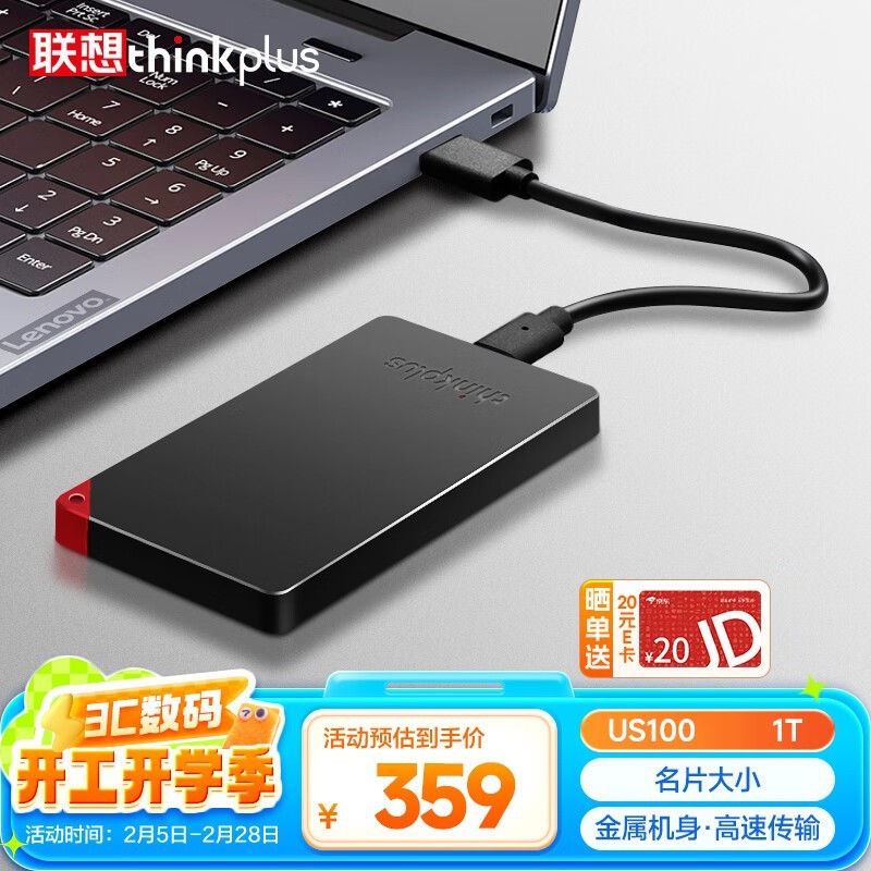 联想 thinkplus 1TB移动固态硬盘 USB3.2高速PSSD移动硬盘小巧便携读取400MB/S US100黑色