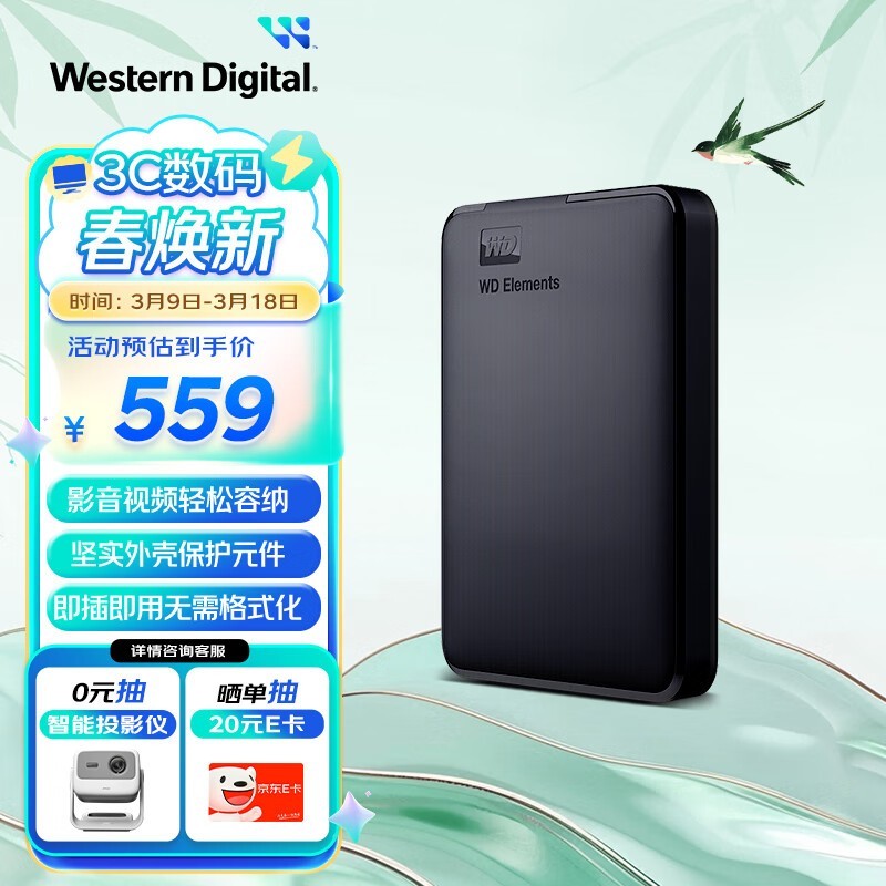西部数据 新元素系列2.5英寸USB3.0移动硬盘2TB(WDBUZG0020BBK)正在促销。西部数据 新元素移动硬盘原价559元,使用满69减10元优惠券后,折后每件只要549元。