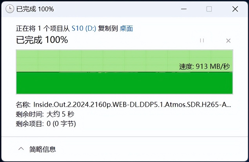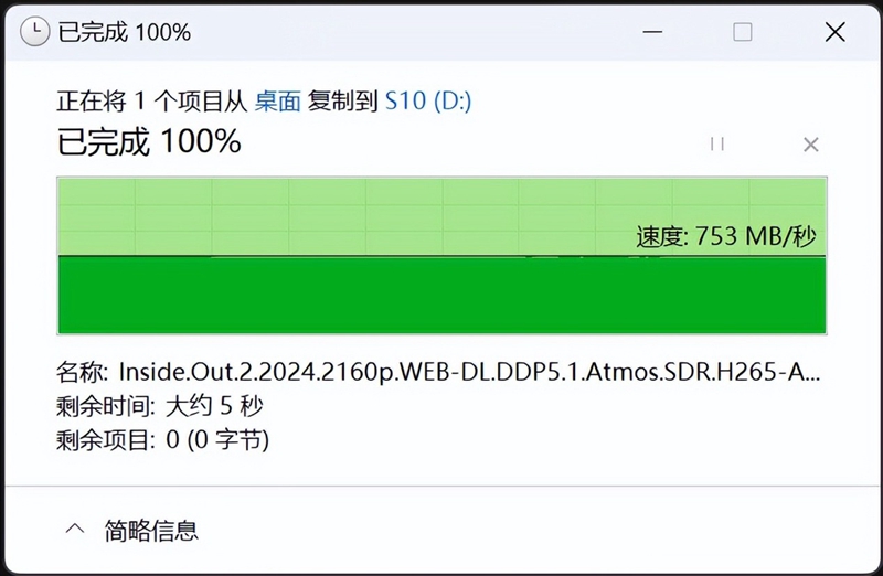 实际文件拷贝,受Windows资源管理器影响,通常比理论数据要低一些。一部14GB的4K超高清电影文件,从电脑拷贝到aigo S10速度达到了750MB/s以上,不到20秒就拷贝完毕,而且速度曲线非常平稳。