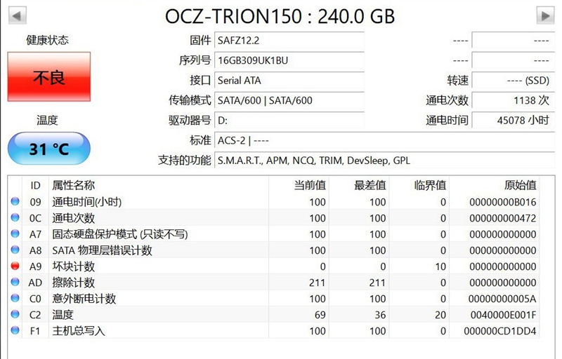 对于机械硬盘来说,应该主要关注3个数据,分别是:05重新分配扇区计数,C4重新分配扇区物理位置事件计数,以及C6无法修正的扇区总数。而固态硬盘则主要需要关注A8 物理层错误计数,A9坏块计数。